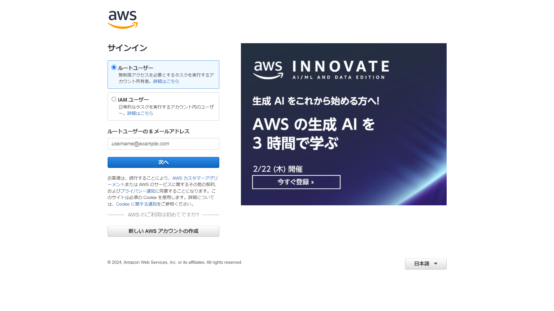 ルートユーザーのメールアドレスを入力、次の画面でパスワードを入力し通常通りログインします。